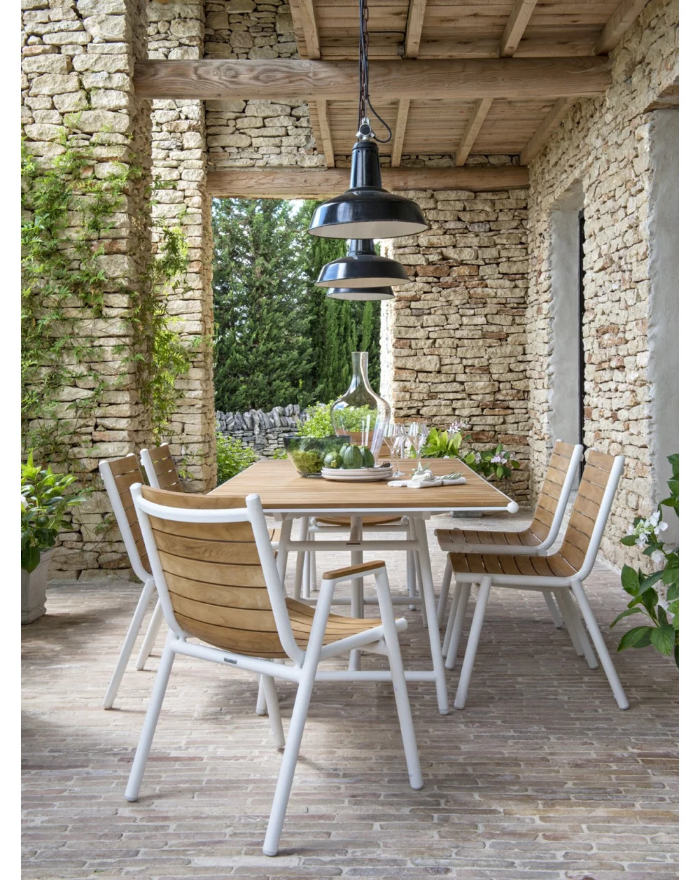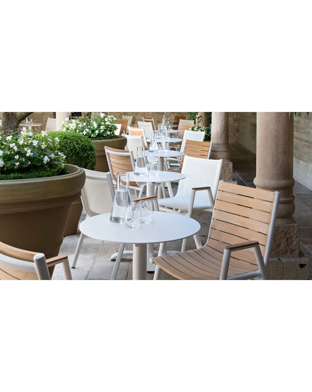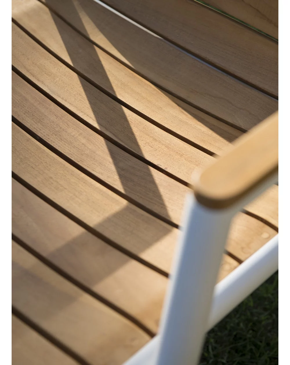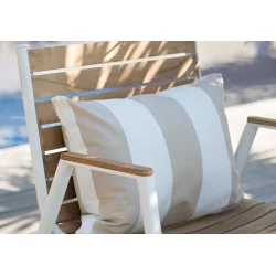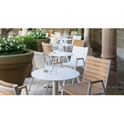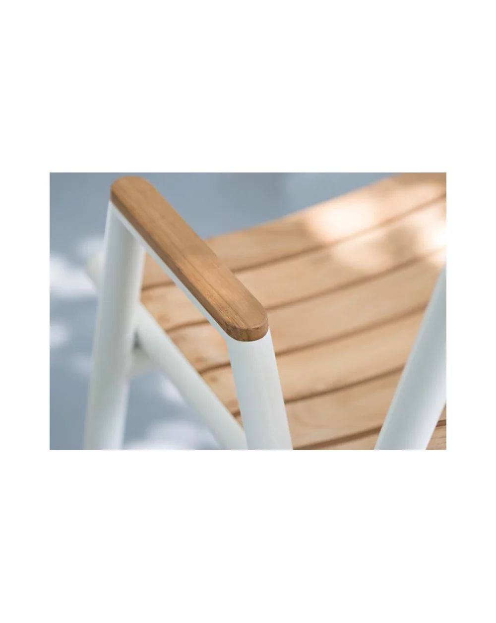 On a base of white lacquered aluminum structure, chairs, bridges, low armchairs and tables are available in all aluminum, aluminum & canvas and teak armrests for the armchair versions and finally aluminum & teak.