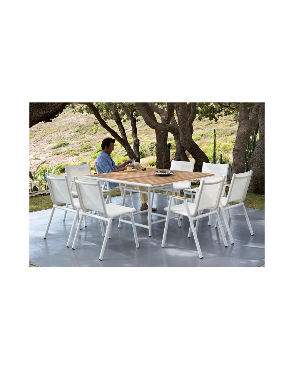 On a base of white lacquered aluminum structure, chairs, bridges, low armchairs and tables are available in all aluminum, aluminum & canvas and teak armrests for the armchair versions and finally aluminum & teak.