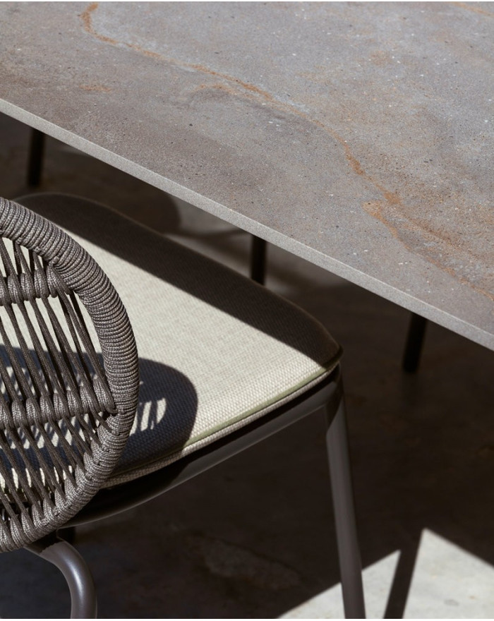 The Kodo dining table has a stylish ceramic top that provides a natural look and feel, as well as slim aluminum legs; Available in 2 colors: Dune white / Shards & Fossil Grey / Flint