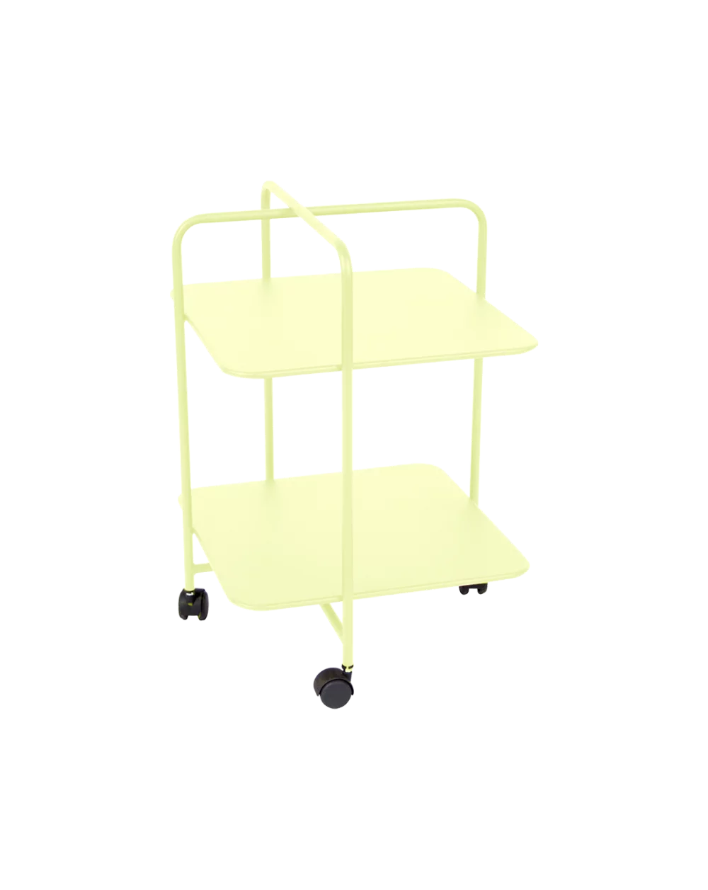Guéridon de la gamme Alfred de Fermob. Guéridon sur roulettes et à double plateau.