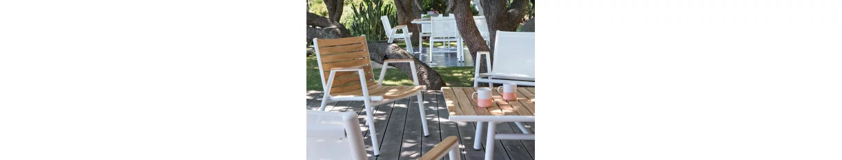Sur une base de structure aluminium laqué blanc, chaises, bridges, fauteuils bas et tables se déclinent en tout aluminiun, en aluminium & toile et accoudoirs teck pour les versions fauteuils et enfin en aluminium & teck.
